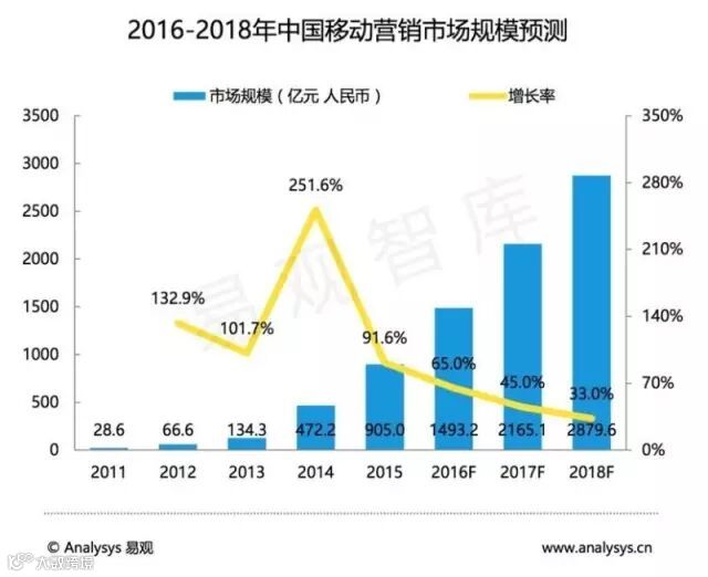 根据Analysys易观数据监测,2015年中国移动营销市场规模达到905.0亿元人民币,预计2016年移动营销市场规模将达到1493.2亿元人民币,同比增长65%。