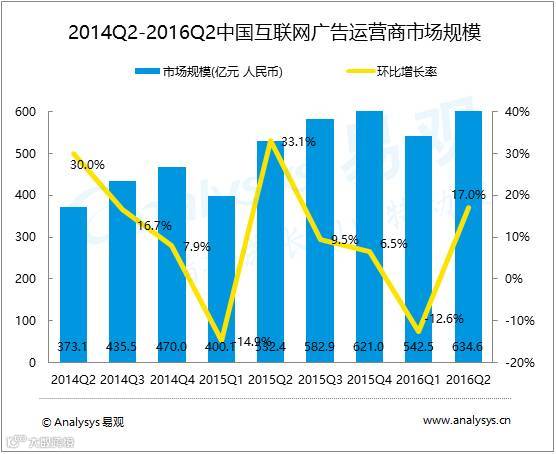 2016年上半年中国互联网广告运营商市场规模达1187.1亿元人民币,同比增长27.3%。