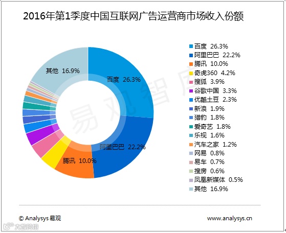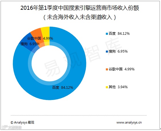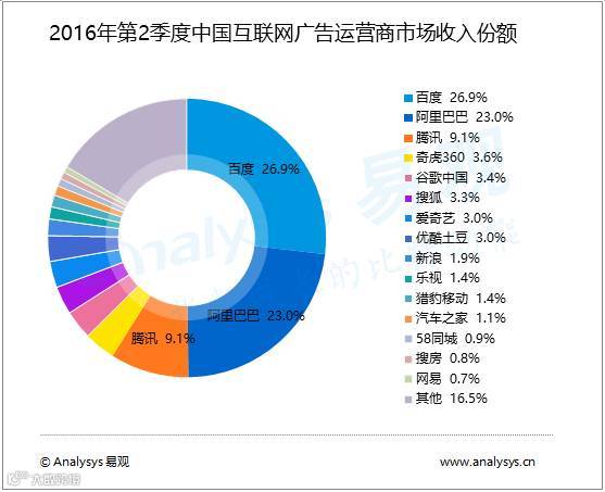 与2016年第1季度相比,第2季度百度、谷歌中国、搜狗依然占据市场前三,市场收入份额继续增加,百度继续处于“垄断”地位。