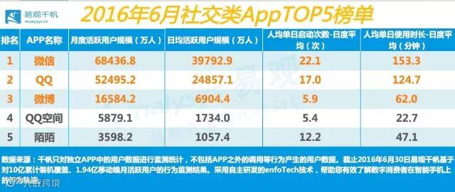 根据易观千帆监测数据显示,其中2016年6月社交应用TOP5如下所示: