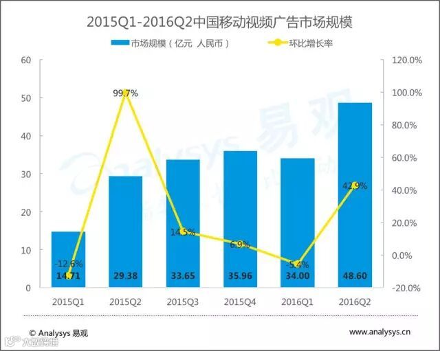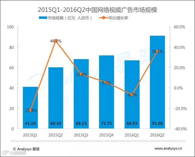 Analysys易观数据显示,2016年上半年中国网络视频运营商市场规模为157.99亿元人民币,同比增长56.1%。