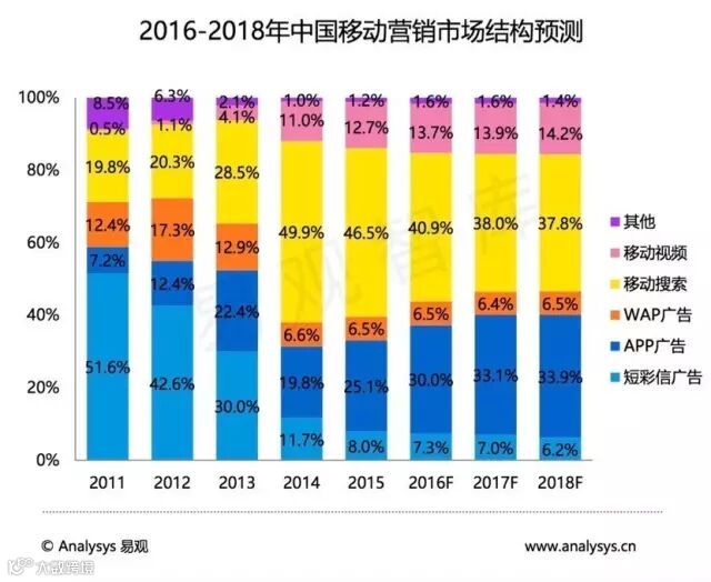 随着移动互联网的快速发展和移动终端设备的广泛渗透,移动营销的商业化进程加速,Analysys易观研究发现, APP 广告稳步增长,2015 年占比达 25.1%;移动视频广告占比小幅增长,占比达12.7%;移动搜索广告占比略有下降, 2015 年占到整体移动营销市场的46.5%。
