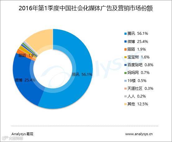 从市场竞争格局来看,2016年第1季度,腾讯、微博保持中国社会化媒体广告及营销市场领军地位。腾讯凭借社会化媒体产品矩阵以及海量用户流量的优势以56.1%的市场份额稳居领先地位;其次为市场份额占25.4%的微博,两者占整体市场规模八成以上。