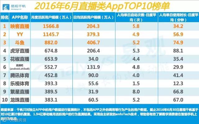 其中,视频直播成为2016年上半年视频领域的最大亮点。映客、花椒、繁星、一直播等视频直播APP相继发力,使中国直播视频市场活跃用户规模爆发式增长,2016年6月,视频直播活跃用户规模达到2704.62万人。其中,2016年6月直播类APP TOP10如下所示: