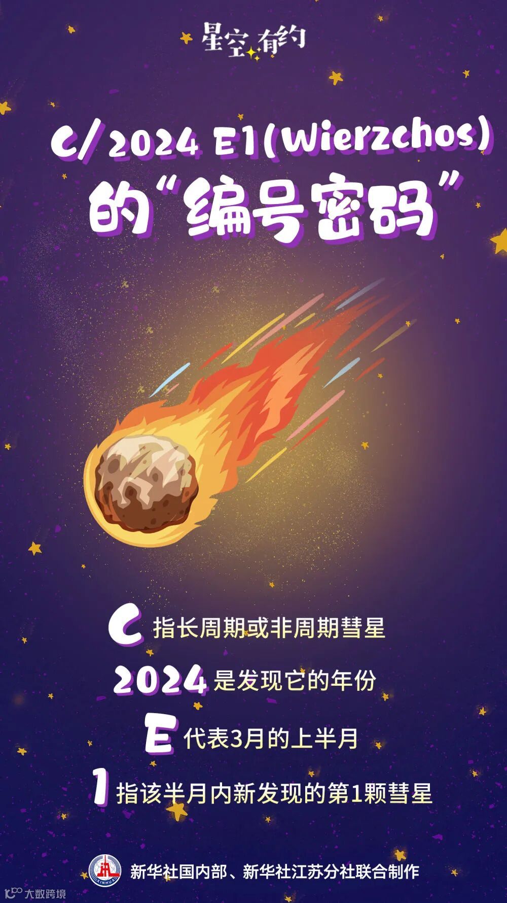 C/2024 E1 (Wierzchos)编号中,“C”表示长周期或非周期彗星,“2024”为发现年份,“E”代表3月上半月,“1”指该半月内首颗新发现彗星。其轨道接近抛物线,将于2月17日最接近地球,随后飞离太阳系。