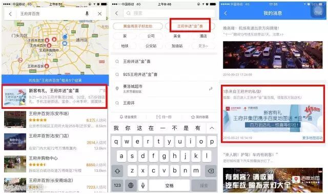 市场嗅觉灵敏的老牌企业王府井,迅速与百度地图组成周年庆“土壕cp”。9月21日-25日期间,消费者打开百度地图,随处可见王府井活动页面,手机注册成为新会员,即可获得一次领取礼品的机会。王府井为顾客准备了金条、面膜套装、随身LED灯及不同商场独享好礼等。