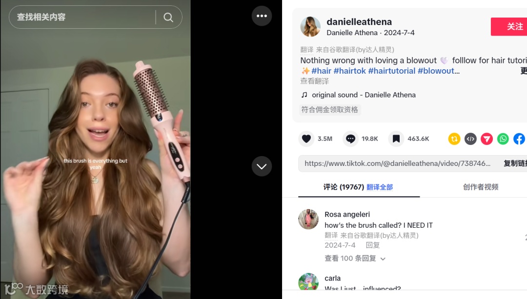 达人合作构建清晰矩阵:头部达人与垂直美妆博主分别贡献超52%和51%销量;尾部达人(粉丝<1万)覆盖广泛,贡献约9%销量,兼顾传播广度与转化精度。美发博主@Danielle Athena发布的实测视频,斩获9660万浏览、350万点赞,强力拉动销售。