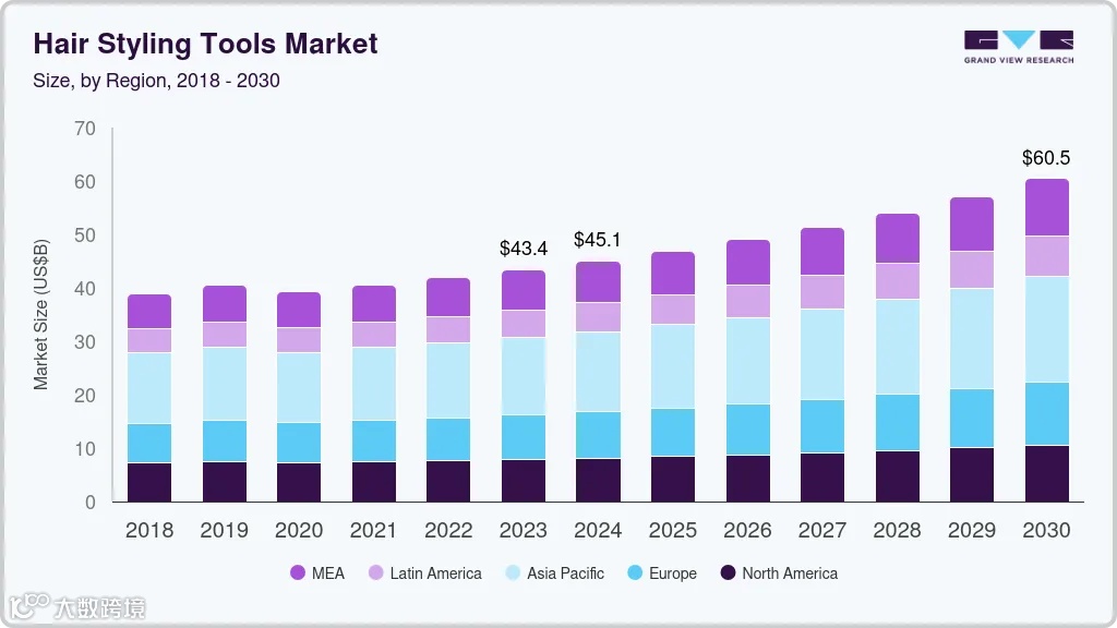全球美发工具市场持续扩容:2023年规模约433.75亿美元,预计2030年达604.83亿美元,2024–2030年复合年增长率约4.9%;个人护理电器市场2025年达244.6亿美元,预计2035年超402.2亿美元,CAGR超5.1%。