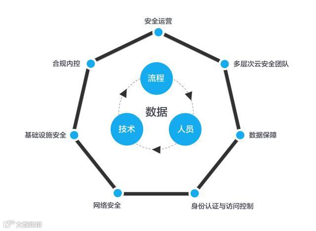 阿里云的每个用户都可以站在阿里云的肩膀上,充分享受阿里云丰富的安全经验和合规成果。阿里云更通过其掌握的云计算核心技术,结合先进的人工智能科技,配合行业专家经验,从人员文化、流程管理、技术发展三个层面打造出一块线上线下融合的云计算数据安全体系,努力消除用户对数据安全的疑问: