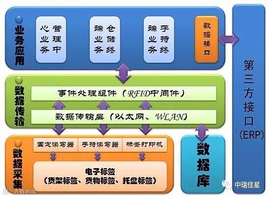 上图显示RFID识别系统各组成部分的逻辑关系以及与用户现有业务系统的逻辑关系。上层应用的各个应用模块管理中心业务、仓储终端业务、手持终端业务与中间件进行数据交换;中间件根据应用模块子模块的指令,通过数据传输层操纵硬件设备(包括固定式读写器、手持式数据采集器、RFID发卡器),并获取硬件设备返回的数据;硬件设备则根据中间件的指令读取或打印电子标签,并且中间件还负责应用程序和数据库之间的数据交换。