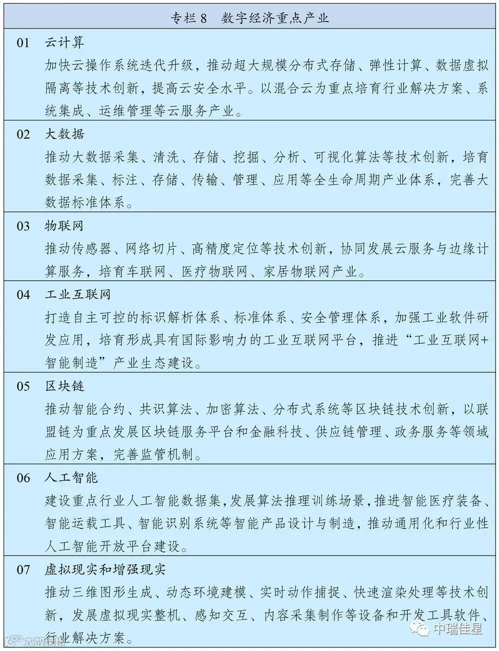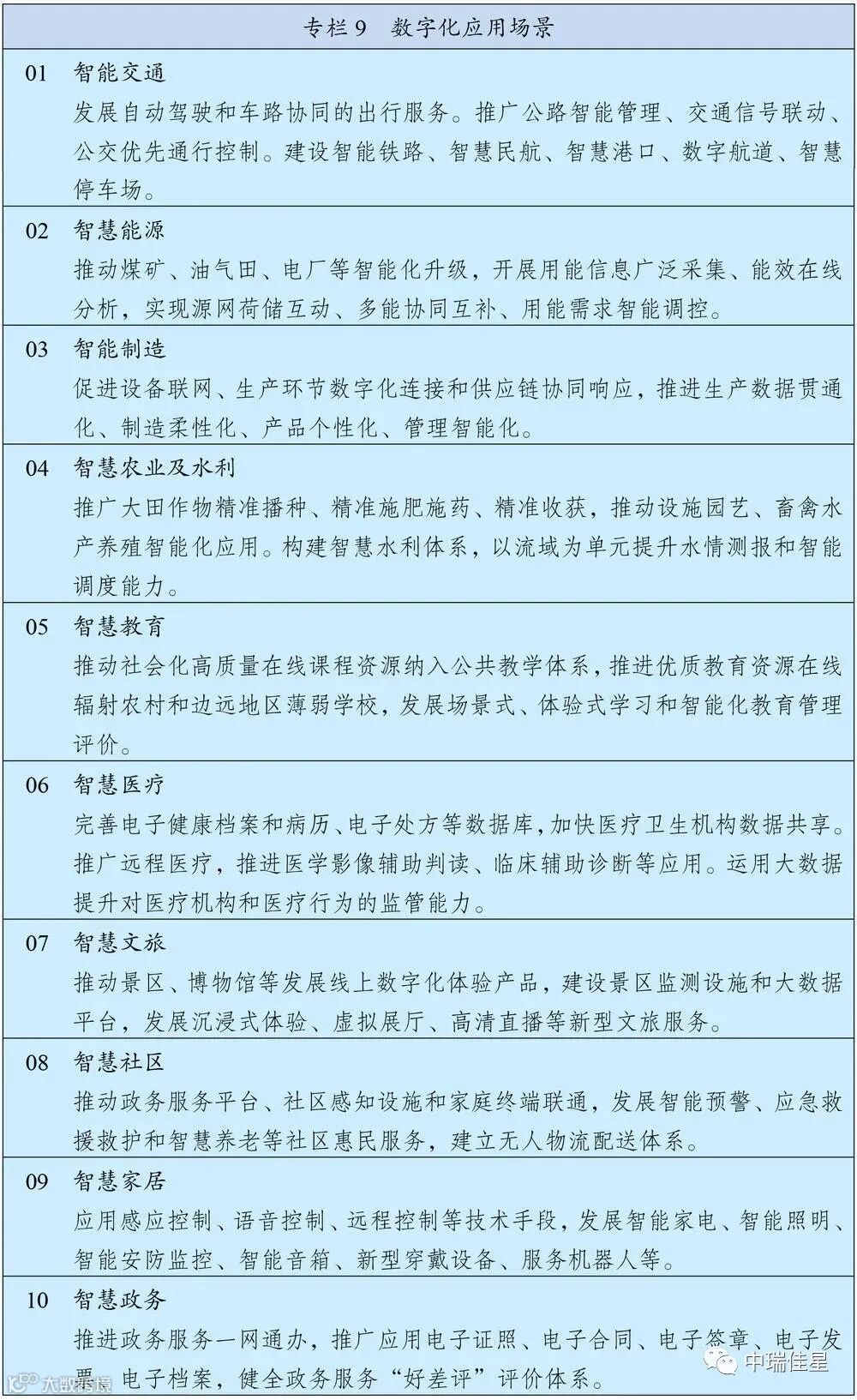 值得数字经济产业从业者特别关注的是,在该篇章中共有两个专栏图表,分别框定了数字经济重点产业和数字化应用场景的具体范围。其中,数字经济重点产业包括云计算、大数据、物联网、工业互联网、区块链、人工智能、虚拟现实和增强现实产业。数字化应用场景则以智能交通为首列,包括能源、制造、农业水利、教育、医疗等10个场景。