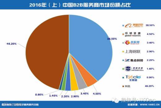 1)2016年上半年,中国B2B服务商市场份额占比中,7家核心企业占比为53.8%。行业格局未发生明显变化,阿里等继续称霸综合类平台,其他中小平台将更深耕垂直业务,继续深挖细分行业需求。