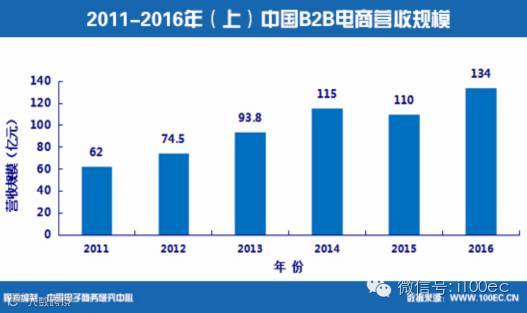 2016年上半年,中国B2B电子商务服务商的营收规模为134亿元,同比增长21.8%。
