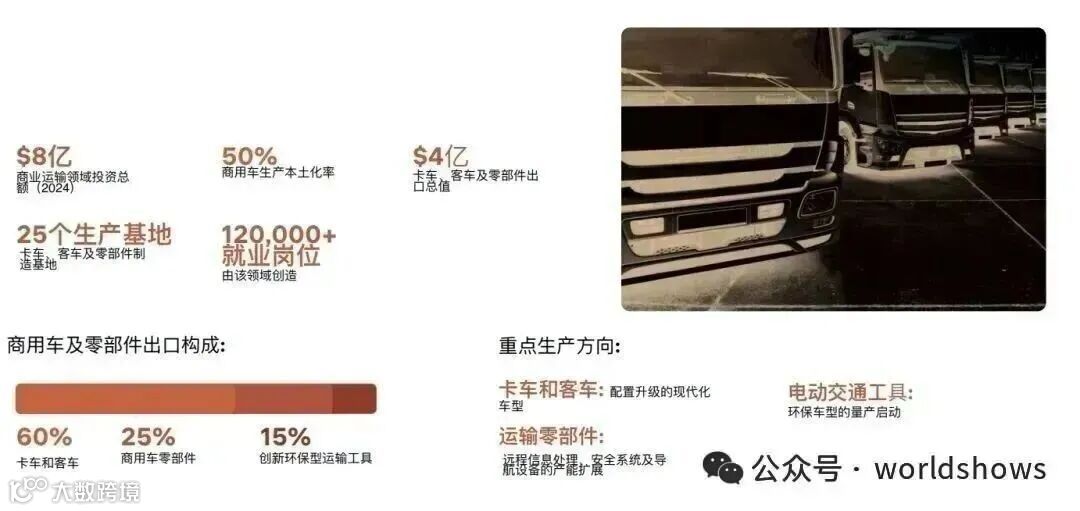 商用汽车市场呈强劲增长态势,载货汽车、客车及专用车需求持续扩大,主要驱动来自基建投入、物流升级与工业扩张。建筑公司对自卸车、搅拌车、吊车等工程车辆采购激增;道路条件欠佳叠加寒冷气候,推高卡车、大巴零部件损耗率,汽配与维保需求长期刚性。