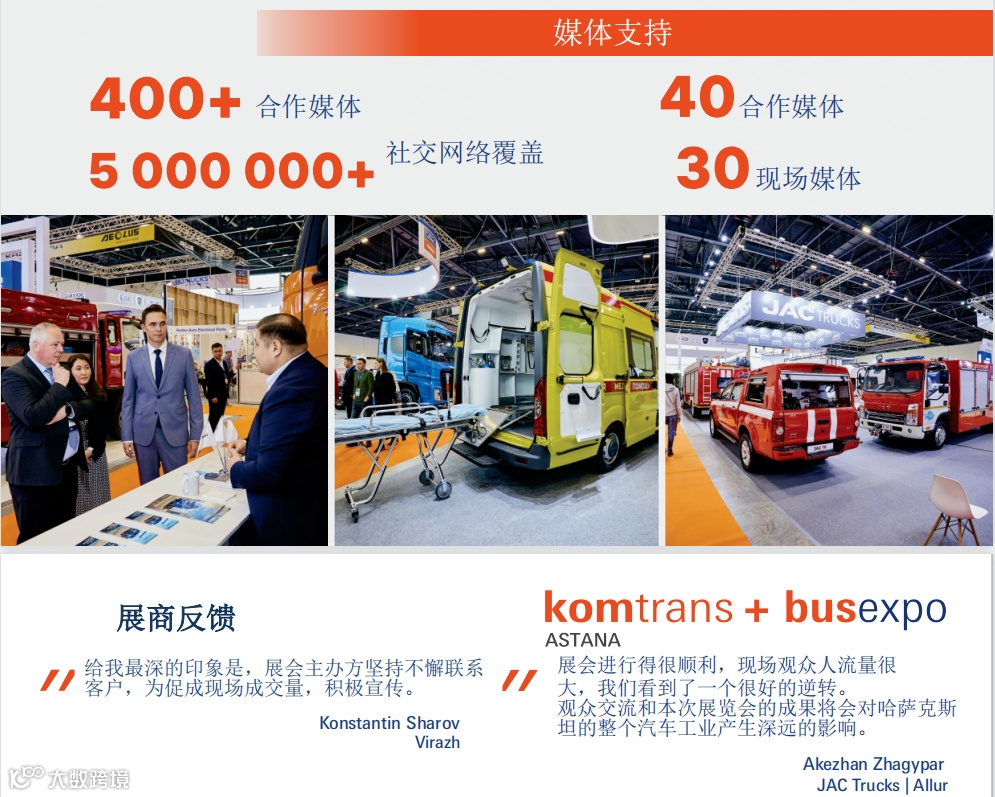 2024年COMTRUX Astana与Automechanika Astana同期同馆举办,总面积超15,000平方米,展商覆盖丹麦、德国、中国、俄罗斯、土耳其等国。本土头部企业Allur(江淮卡车哈方代理商)等积极参与。2025年起,COMTRUX将独立办展,进一步扩容商用车专业展示平台。