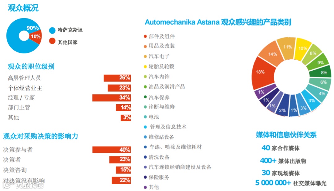 2024年Automechanika Astana展览总面积达15,300平方米,创历史最高纪录,为上届两倍;吸引来自丹麦、德国、印度、意大利、中国、俄罗斯、土耳其、韩国、日本等21个国家的483家展商,展商数量与国际化程度显著提升。土耳其、印度、韩国展团首次亮相。