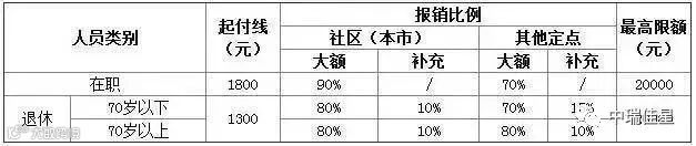 1、在职职工到医院的门诊、急诊看病后,1800元以上的医疗费用才可以报销,报销的比例为在社区医院90%、其他定点医院70%,最高限额可报20000元。