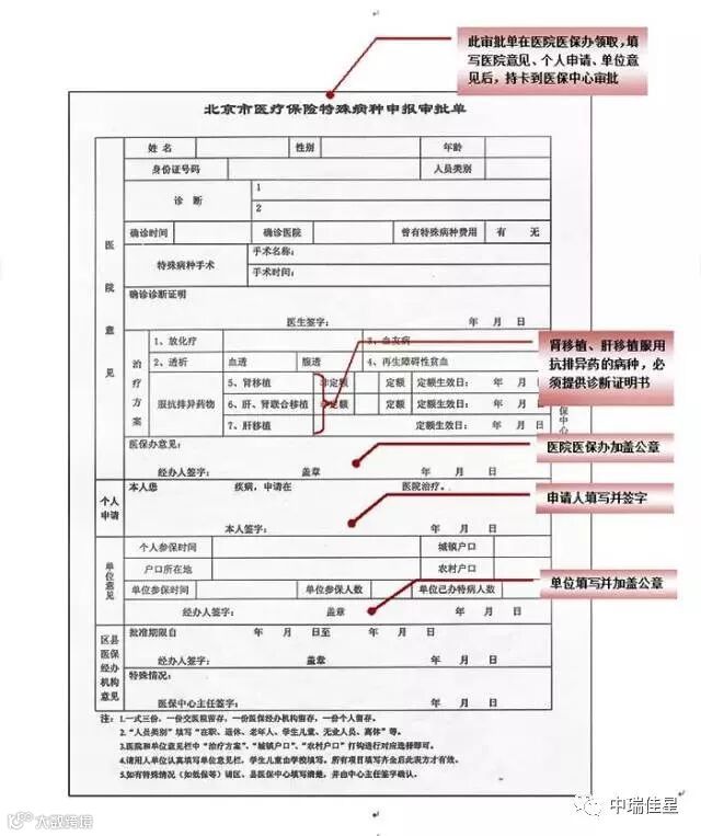 1、患以上疾病的参保人员如需在门诊就医时,由参保人就医的二、三级定点医院开据“疾病诊断证明”,并填写《北京市医疗保险特殊病种申报审批表》,报区医保中心审批备案。