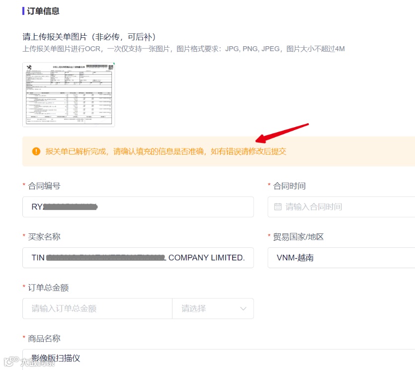 已有报关单:上传报关单图片,系统自动识别合同编号等关键信息,核对无误后确认即可;暂未取得报关单,可后续补充物流信息时一并上传。