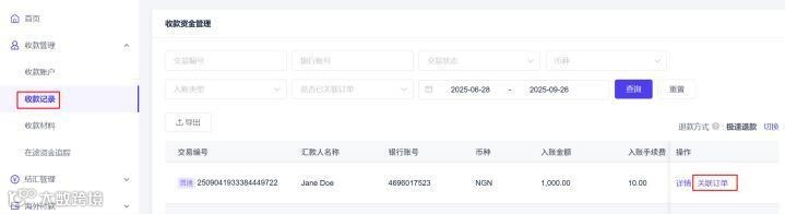 进入“收款资金管理”,找到对应入账交易,点击“关联订单”,选择已审核通过的报关结汇收款材料完成关联,等待风控审核入账。