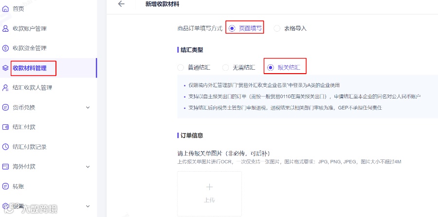 登录云捷汇官网,进入“收款材料管理”,选择“页面填写”方式,结汇类型勾选“报关结汇”: