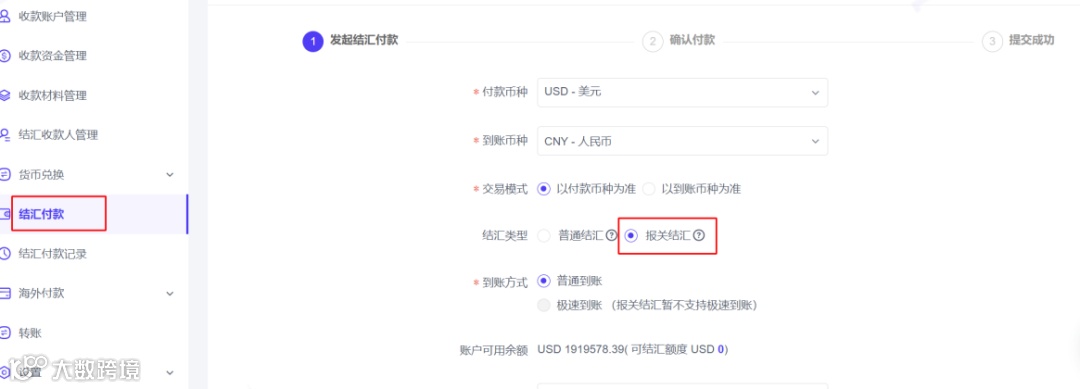 资金入账后,进入“结汇付款”菜单,结汇类型选择“报关结汇”,收款账户填写本企业对公人民币账户,输入交易金额即可提交申请。