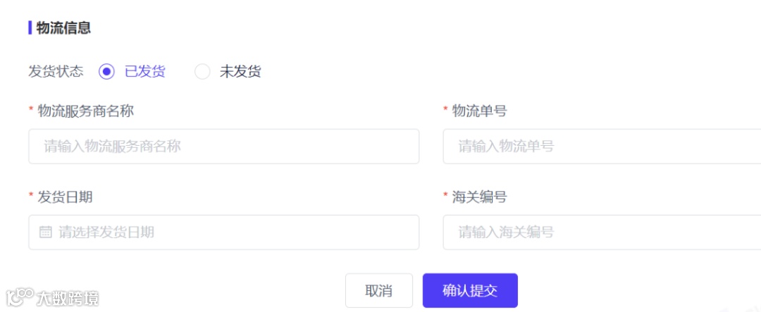 物流与报关单均完备时,发货状态选择“已发货”,填写物流服务商名称、物流单号、发货日期、海关编号等;任一信息缺失,则选择“未发货”。