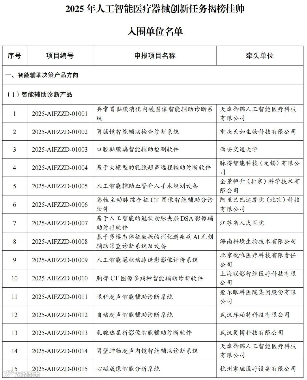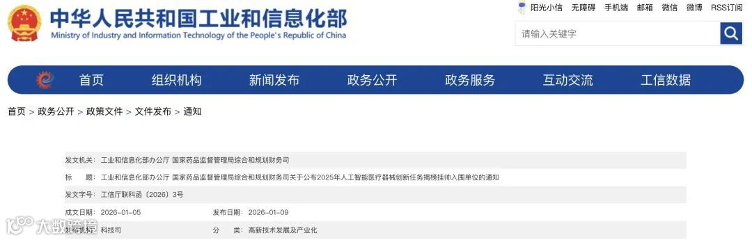 近日,工信部官网发布《2025年人工智能医疗器械创新任务揭榜挂帅入围单位的通知》。