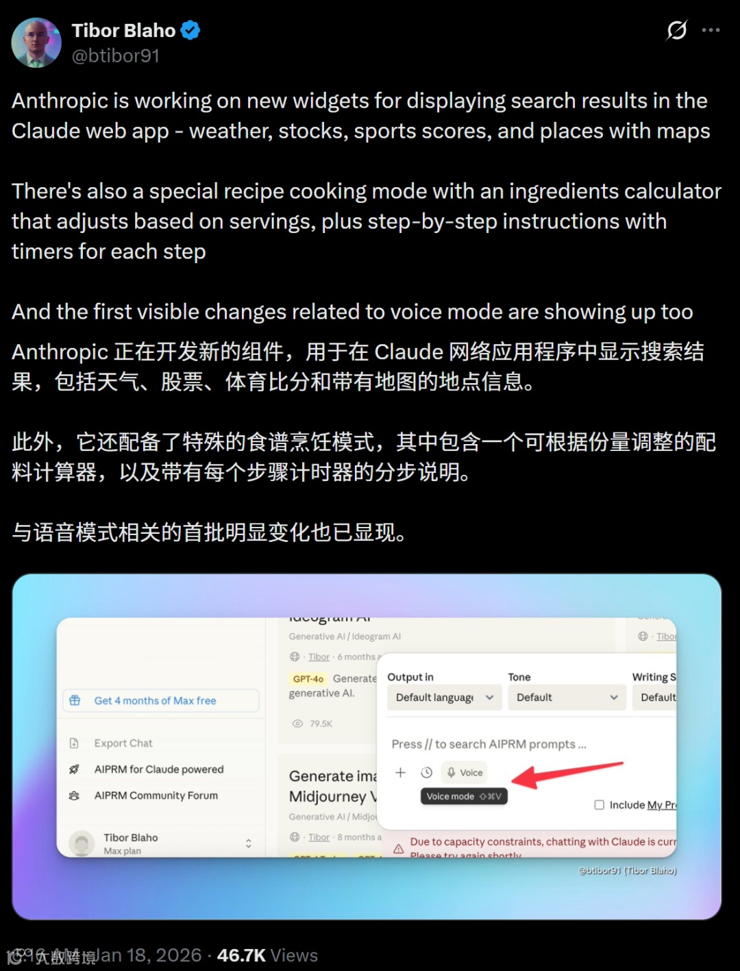 Claude Web端语音输入功能正在开发中,有望实现低延迟、高准确率的自然语音交互;同时,Pixelate图像转像素头像功能已完成质量优化,并已覆盖桌面客户端。