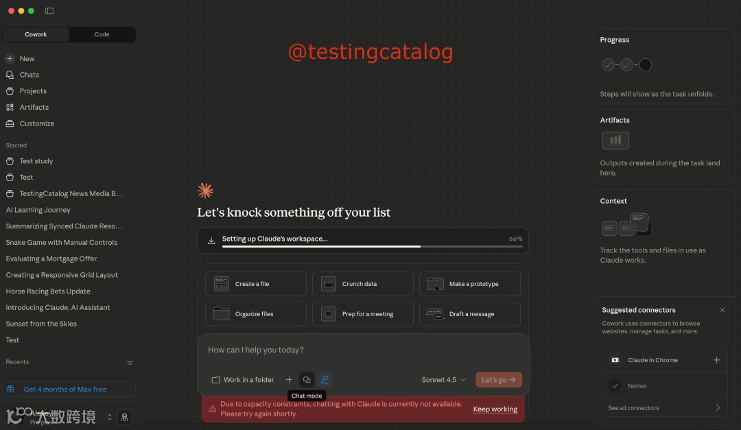 Cowork模式将全面整合Chat功能,不再作为平行选项存在。未来Claude Desktop将以Cowork为唯一主界面,提供融合对话、文件解析、多步骤自动化与结果沉淀的一体化工作台。
