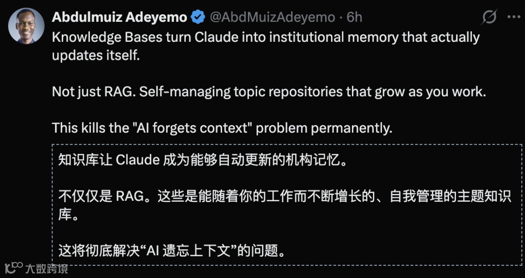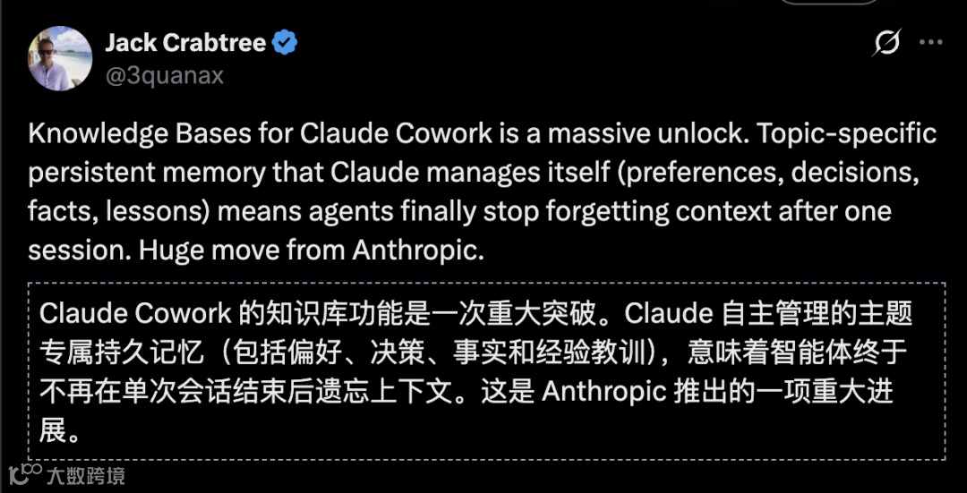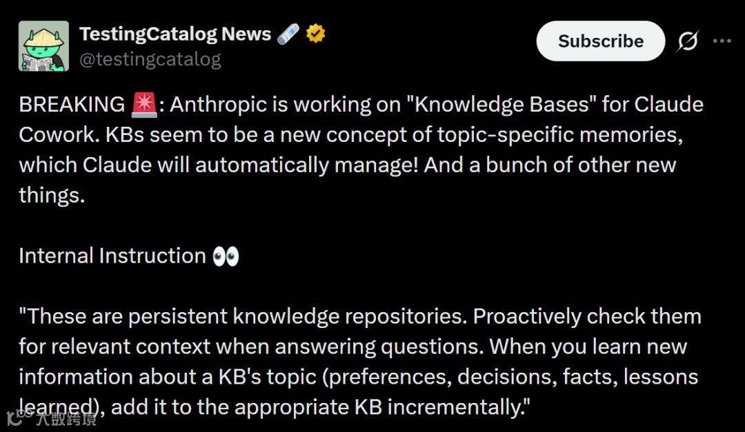 Anthropic再度引爆硅谷:据消息人士透露,Claude Cowork即将上线知识库功能,首次赋予AI「永久记忆」能力。