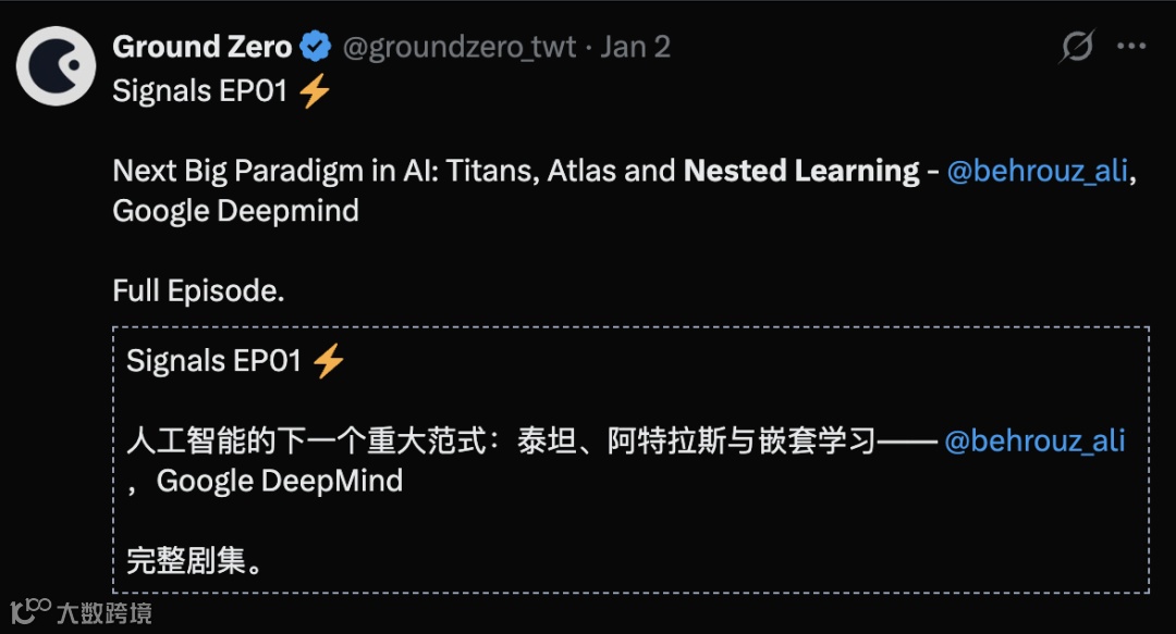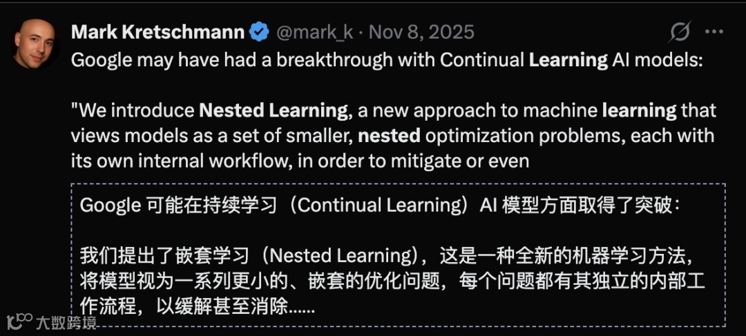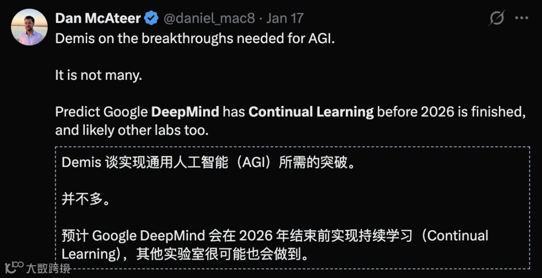 DeepMind CEO Demis Hassabis预测,持续学习的关键突破将在2026年底实现。其团队已推出递归语言模型、Titans/Atlas架构及嵌套学习(Nested Learning)等新范式,其中嵌套学习被广泛视为持续学习的重大进展。