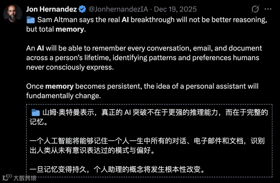 OpenAI已于2024年9月上线ChatGPT记忆功能,并在2024年4月进一步扩展为跨会话个性化记忆。Sam Altman曾表示:“真正的AI突破不在推理,而在持久记忆——它将彻底重塑AI助理的定义。”