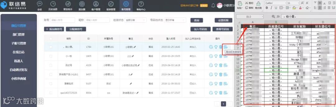 3、在微信号管理中,增加导出已登录微信号的好友微信号,点击操作中的到处按钮即可导出该微信号的好友微信号。