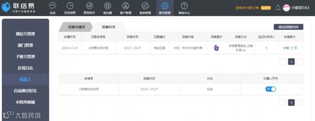 2、启用时间段回复机器人。需注意,时间段回复机器人屏蔽了在联络易系统已登录的微信号。