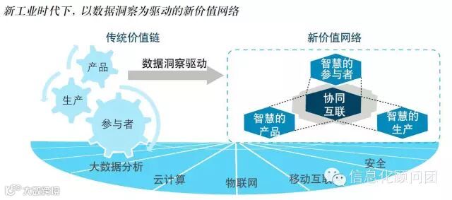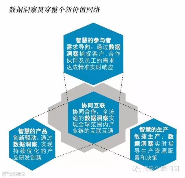 参与者、产品、生产是价值创造过程中的三个要素。在传统价值链下,三者之间缺乏交互作用,联系不紧密,企业以自有资源寻求客户和合作伙伴,以自有生产能力进行模式化产品的制造。在新价值网络下,通过大数据、云计算、物联网、移动互联网等新一代信息技术平台的作用,企业能够获得精准的数据洞察,以此为核心驱动力,改造整个研发、生产、销售等环节,实现参与者、产品和生产的协同互联;同时,数据洞察始终贯穿参与者、产品和生产三个要素,使它们具有智能分析能力和自我优化能力,实现“智慧的参与者”、“智慧的产品”、“智慧的生产”的角色转变。