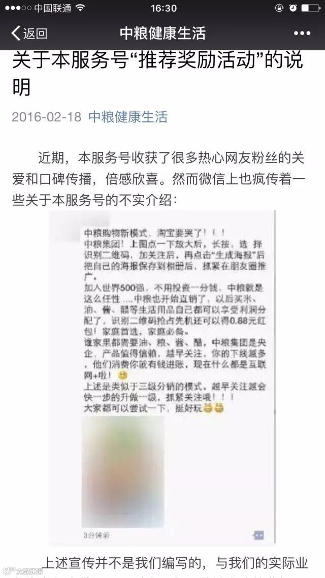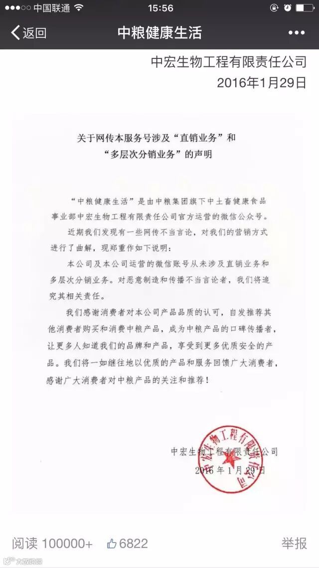 其实早在1月29日,“中粮健康生活”发布公告称,公司及公司运营的微信账号从未涉及直销业务和多层次分销业务。