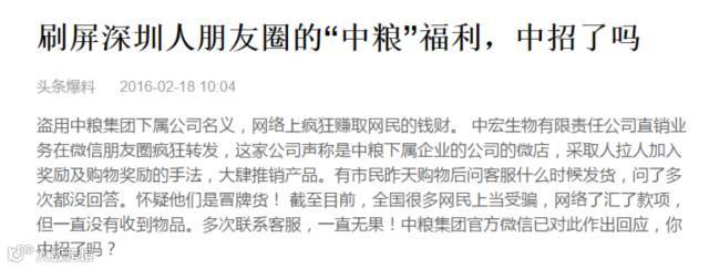 有人在网上爆料:盗用中粮集团下属公司名义,疯狂赚取网民钱财, 中宏生物有限责任公司直销业务在微信朋友圈疯狂转发,这家公司声称是中粮下属企业的公司的微店,采取人拉人加入奖励及购物奖励的手法,大肆推销产品。