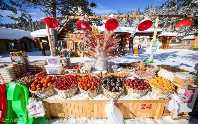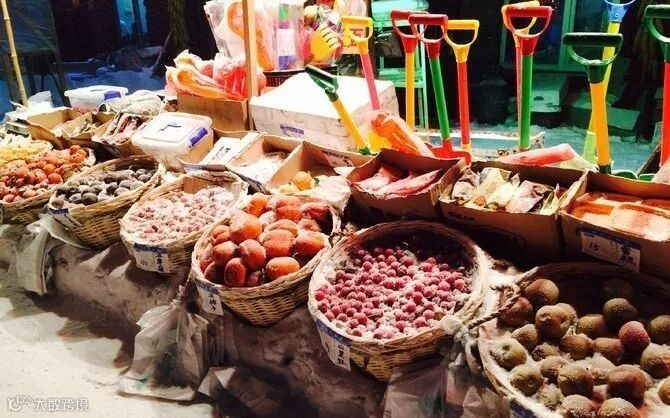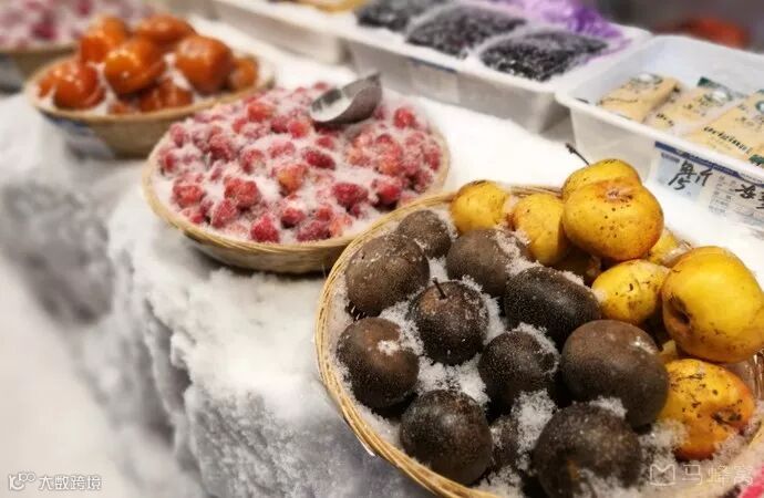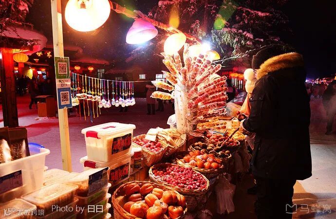 雪韵大街的两侧,各种买卖小贩都在不停地吆喝,纪念品、冰糖葫芦、红薯、冻梨、冻柿子等等,都是按着东北传统方法保留下来的水果,别有一番滋味~