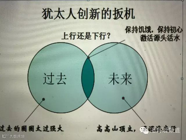 探寻犹太人的创新密码,是我那次考察以色列的重点。我向希伯来大学81岁的奥曼教授请教,他用两个圆的交汇来说明犹太人的创新。每一个当下的人生,都是两个圆的交汇,一个是过去的圆,一个是未来的圆。对大多数人来说,因为过去的圆成就了你——里面有太多的经验、习惯、知识、技术、矛盾、纠结、理论、理念、教条、利益、身份、名望等等——它会形成强大的习性,一直拽着你沿着旧有的轨道下坠。而每个以色列人心目中,同时还有一个未来的圆,那是他们最初关于未来的梦想,是未来的一幅大画面。如果时时处处想着这个未来的大画面,分分钟与未来建立连接关系,分分钟从未来思考当下的做法,那就注定会有创新冒出来。