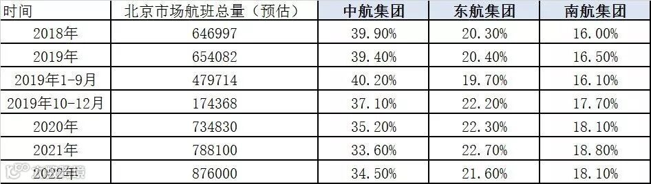 基于此,模拟测算了2018-2022年北京航空市场三大航空集团的市场份额,见表16。