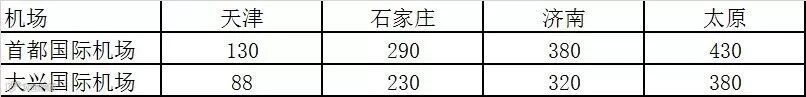 表3说明,首都国际机场对66%的北京常住人口而言,有较便捷的地理位置优势。而在与华北平原的省会城市上,大兴国际机场地处华北平原中间地带,更有地理位置优势。表4是北京“两场”前往华北平原中心城市的直线距离。