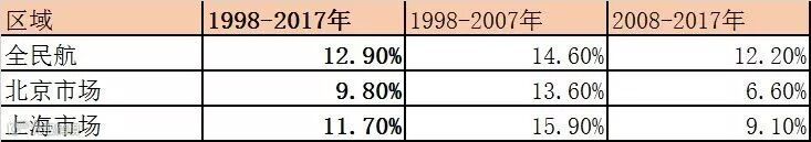 以旅客吞吐量为指标,表1统计了1998-2017年全民航、北京(首都国际机场和南苑机场)、上海(虹桥国际机场和浦东国际机场)年均增幅。