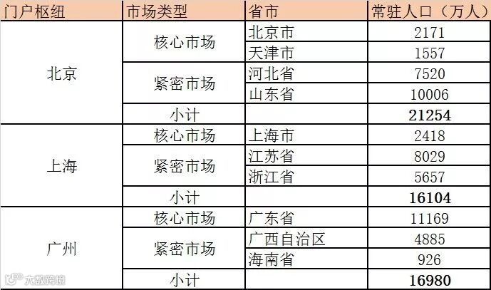 基于2017年中国各地区的常驻人口统计,我们将北京、上海、广州三大门户枢纽所覆盖的市场分为核心市场和紧密市场,表2统计各区域内的常驻人口。
