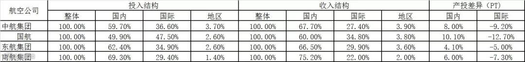基于国内三大航空集团2017年报,统计三大航空集团在航空市场的投入与收入结构见表5,国内三大航空集团投入与收入结构。