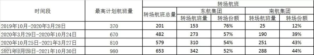 表13东航集团和南航集团的转场航班运营统计 单位:班次