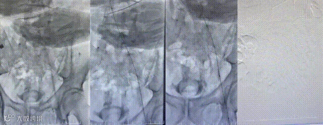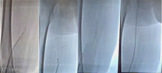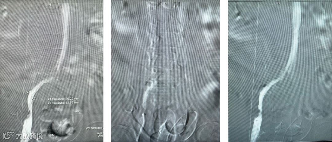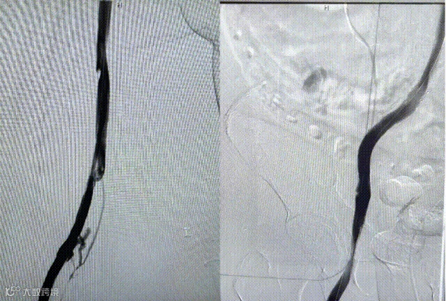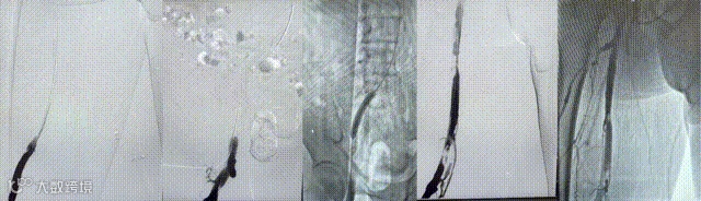 (四)导入球囊(10*80mm)扩张髂股静脉,再次造影见髂总静脉闭塞