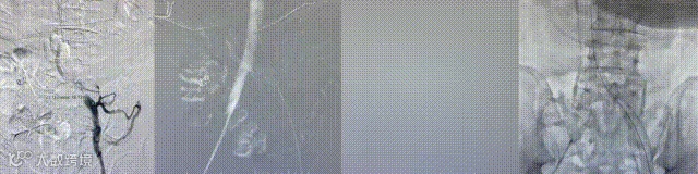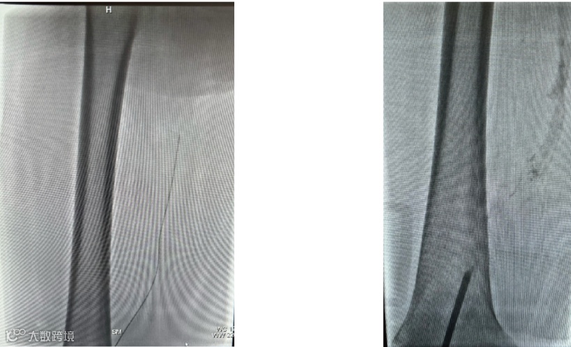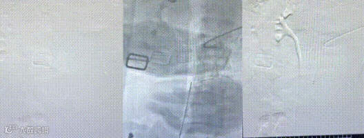 (二)导丝交换置入长鞘,推送入腔静脉可回收滤器,路图模式下定位于肾静脉下缘释放滤器,再次造影见滤器形态位置满意。超声引导下穿刺左腘静脉成功,置入10F导管鞘,经鞘导入泥鳅导丝及单弯导管,反复尝试到达下腔静脉。