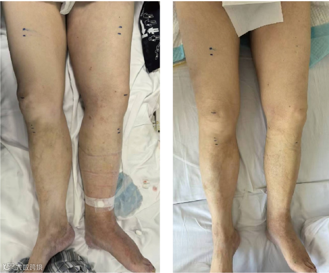 双下肢发育正常,等长不等粗,左下肢全程肿胀,张力稍高,压之无凹陷,无明显压痛,皮温正常,下肢皮肤局部可见青紫斑,无下肢皮肤脱屑、湿疹、异常色素沉着及溃疡形成。双足背动脉搏动可及,双股动脉搏动可及,运动可及,神经系统阴性。