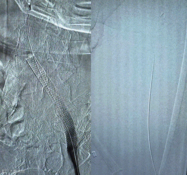 (五)导入支架(14*90mm)覆盖髂总静脉压迫处,再次造影见髂股静脉通畅。拔除导管及导管鞘,术中出血约 300ml,术后患者安返病房。
